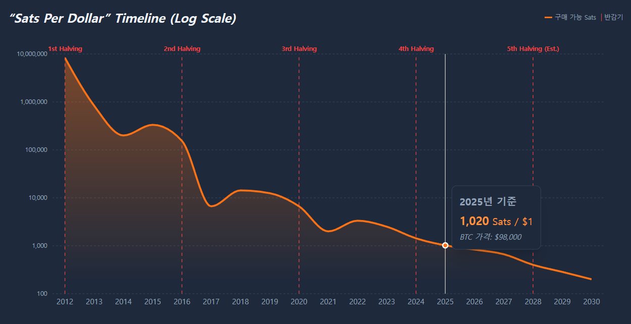 [첨부 이미지 1: 1달러당 구매 가능한 사토시(Sats) 차트]