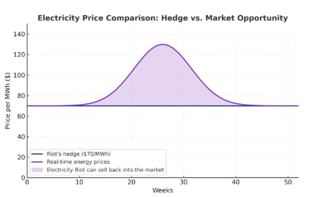 나머지 15%(가격 급등 시): 전기 요금을 헷징(고정)해 둔 비트코인 채굴자는 미리 구매해 둔 전력을 시장에 다시 되팔 수 있습니다.